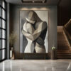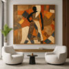 A imagem retrata uma composição geométrica abstrata que evoca a relação entre o Sol e a Lua. A grande lua crescente em branco parece abraçar um círculo dourado, que remete ao Sol, criando um jogo de equilíbrio entre os elementos. As texturas rústicas e os tons terrosos conferem à obra um aspecto orgânico e atemporal, remetendo a uma conexão ancestral com o cosmos. As divisões do fundo, alternando entre dourado, marrom e preto, reforçam a dualidade e o contraste entre luz e sombra. A simplicidade das formas geométricas, aliada à riqueza de detalhes na textura, transmite uma sensação de harmonia e estabilidade. A obra pode ser interpretada como uma representação da complementaridade dos opostos, o equilíbrio entre forças distintas que coexistem e se influenciam mutuamente. Com uma estética minimalista, mas profundamente simbólica, essa pintura convida à contemplação e sugere um diálogo entre o universo, o tempo e a natureza cíclica da existência.