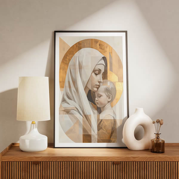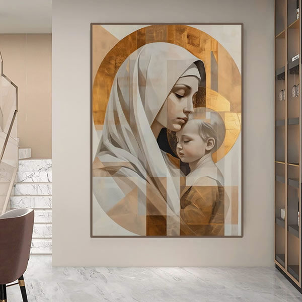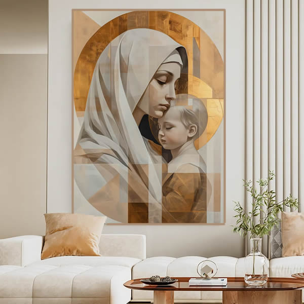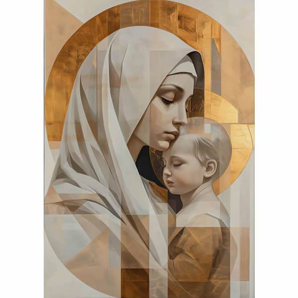 Esta pintura retrata Maria e o menino Jesus em uma composição que combina elementos clássicos e modernos. Utilizando uma paleta de cores suaves e cálidas, predominando os tons dourados e ocres, a obra evoca uma sensação de paz e espiritualidade. Maria é representada com um véu que emoldura seu rosto, seu olhar sereno e cheio de amor direcionado ao filho, que está aninhado em seus braços, dormindo tranquilamente. A expressão de ambos transmite uma profunda conexão emocional, simbolizando o amor maternal e a proteção divina. A técnica utilizada combina formas geométricas com traços suaves, criando um efeito tridimensional que dá profundidade à imagem. As formas geométricas douradas que circundam as figuras principais sugerem halos sagrados, destacando a sacralidade dos personagens. A composição é equilibrada e harmônica, convidando o observador a refletir sobre a pureza e a beleza da relação entre mãe e filho. Este retrato de Maria e Jesus é uma celebração da fé e do amor incondicional, transmitindo uma mensagem de esperança e redenção.