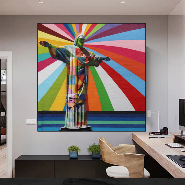A arte contemporânea tem atraído muito olhares à cada dia que passa, com seus estilos e tendências surpreendentes e criativos. Nesta obra, vemos o nosso olhar dirigido à estátua de Jesus pintada em uma parede de um edifício. Um dos estilos de arte que estão emergindo ultimamente é a pop arte, associado às cores vibrantes e vivas que se misturam para formar desenhos absolutamente únicos.