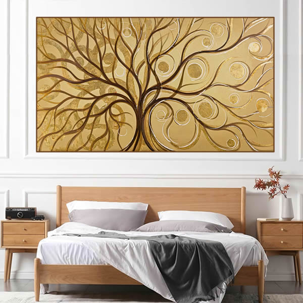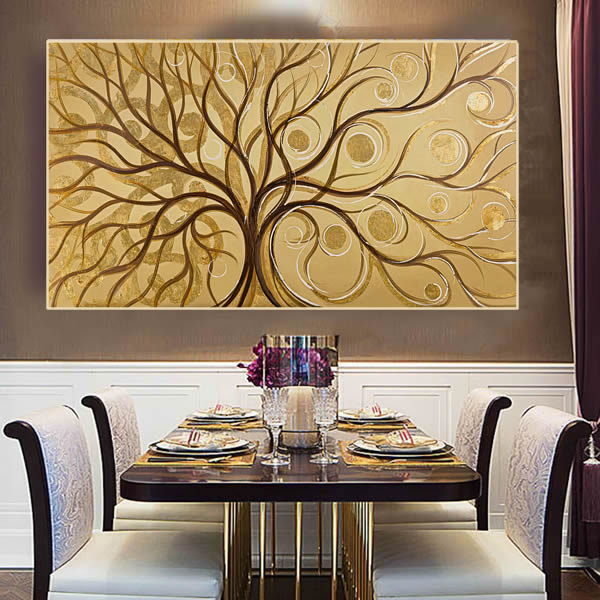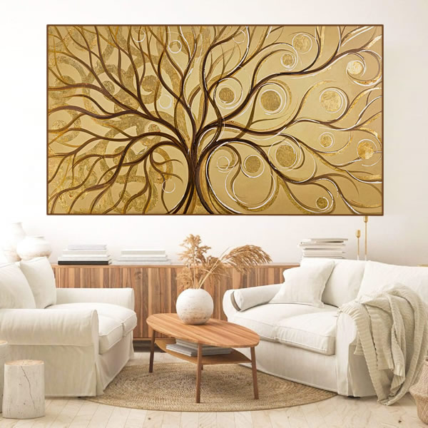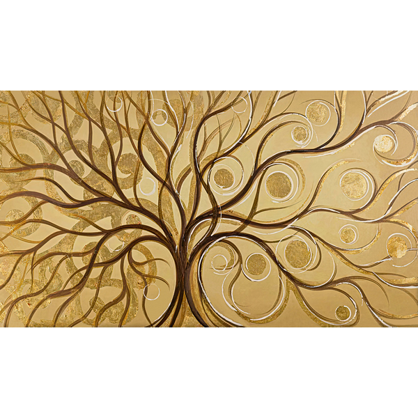 O toque especial desta pintura vem da mistura de estilos artísticos. O trabalho mescla elementos e o resultado é um quadro extraordinário, autêntico, vibrante e único. As sombras e luzes refletidas pelas folhas douradas produzem um efeito lindo e lúdico que extrapola as fronteiras da arte.