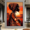 Esta obra exuberante retrata cinco figuras femininas afro estilizadas, vestidas com mantos fluidos em tons quentes e vibrantes de laranja, amarelo, vermelho e vinho. As formas alongadas e elegantes dos corpos, combinadas com o contraste marcante entre o preto das peles e o fundo dourado, evocam uma sensação de força e orgulho ancestral. O estilo geométrico das roupas e dos turbantes cria um ritmo visual que guia o olhar suavemente entre cada personagem, sugerindo unidade, identidade e irmandade. A ausência de traços faciais transfere a atenção para os contornos expressivos e a linguagem corporal das figuras, permitindo que o espectador projete suas próprias emoções na cena. A composição é carregada de simbolismo e espiritualidade, celebrando a beleza, a dignidade e o papel central da mulher negra na cultura e na história. A paleta quente e o movimento circular das linhas conferem à obra uma energia vibrante e, ao mesmo tempo, meditativa — um tributo visual à resiliência e à elegância feminina africana.