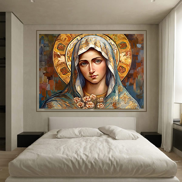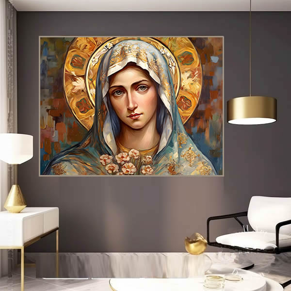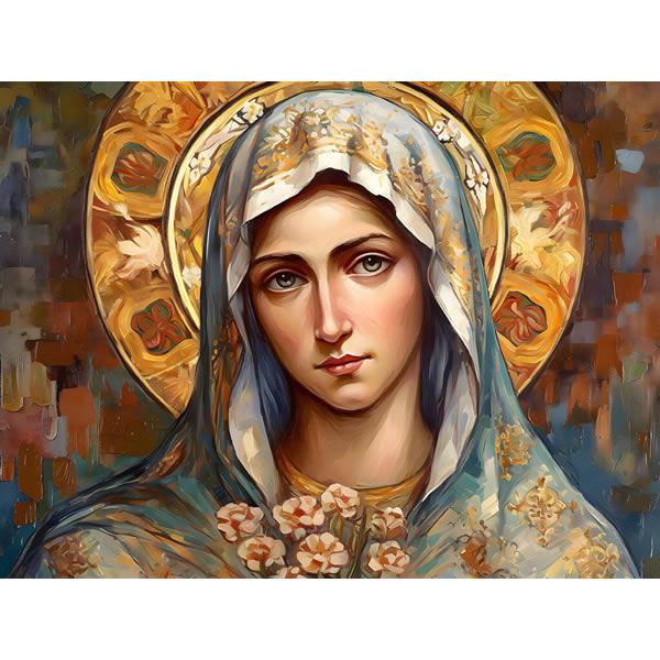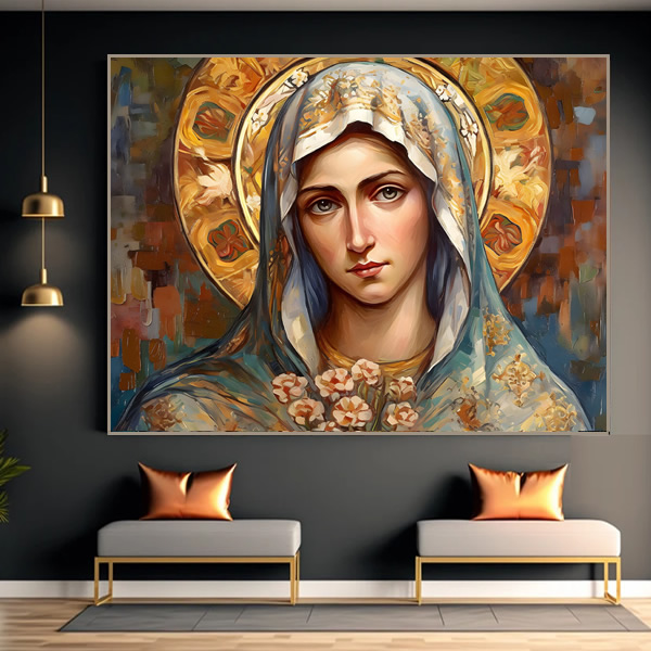 Esta pintura cativante de Nossa Senhora é uma representação sublime que combina um profundo sentido de espiritualidade com uma estética vibrante e detalhada. A figura de Maria é retratada com uma expressão serena e contemplativa, os olhos baixos e uma leve inclinação da cabeça, que evocam uma sensação de humildade e reverência. Sua auréola, ricamente decorada com padrões que lembram as tradicionais artes sacras, brilha intensamente ao redor de sua cabeça, sugerindo sua divindade e papel central no Cristianismo. O manto de Maria, adornado com flores e motivos dourados, drapeja graciosamente sobre seus ombros, oferecendo uma textura rica e uma paleta de cores que varia do azul profundo ao dourado luminoso. Estes elementos não apenas realçam sua figura sagrada, mas também simbolizam sua pureza e a luz que ela traz ao mundo. A combinação de realismo no rosto de Maria com os elementos estilizados de seu manto cria uma obra de arte que é ao mesmo tempo acessível e etérea, oferecendo aos observadores uma janela para a beleza transcendental e o poder calmante da figura materna mais venerada na fé cristã.
