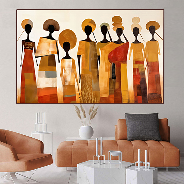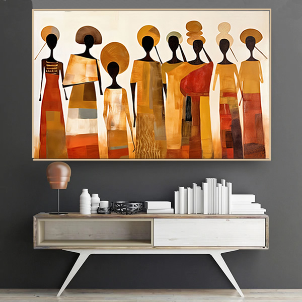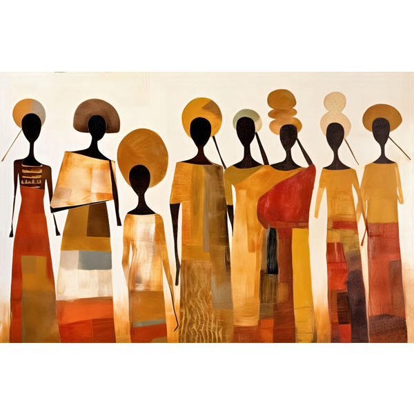 Esta obra retrata a união e força de um grupo de figuras femininas estilizadas, cuja silhueta alongada e esbelta cria um ritmo harmonioso e suave. As vestimentas, em tons terrosos, alaranjados e dourados, remetem a um contexto cultural africano, onde a simplicidade se une à elegância. Cada figura, desprovida de feições detalhadas, evoca uma sensação de anonimato que transcende o indivíduo e passa a simbolizar uma coletividade, enfatizando a identidade comum e a força das tradições. O uso de formas geométricas nas roupas e nas figuras sugere uma fusão entre o moderno e o tradicional. As cabeças adornadas por formas circulares insinuam a importância de rituais e cerimônias, ao mesmo tempo em que criam um contraste marcante com a fluidez dos corpos. A pintura expressa, de forma sutil, a beleza da comunidade e a conexão com as raízes, destacando a força das culturas ancestrais através de uma abordagem minimalista e abstrata.