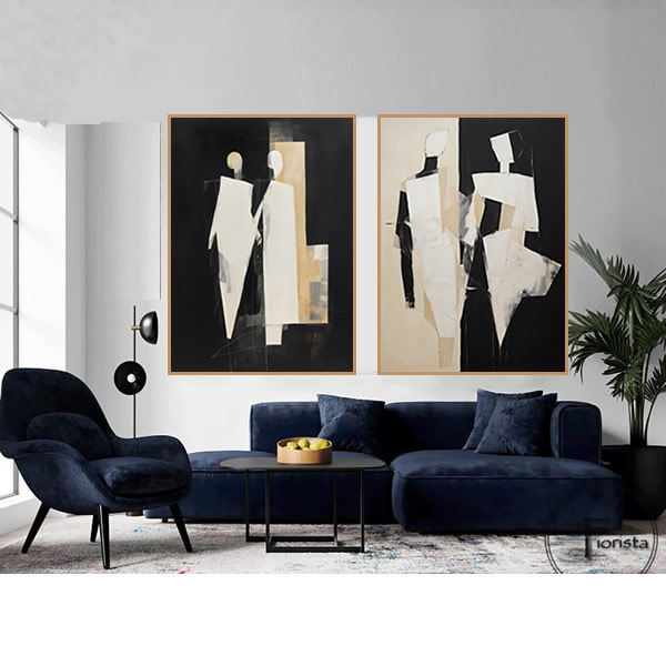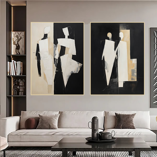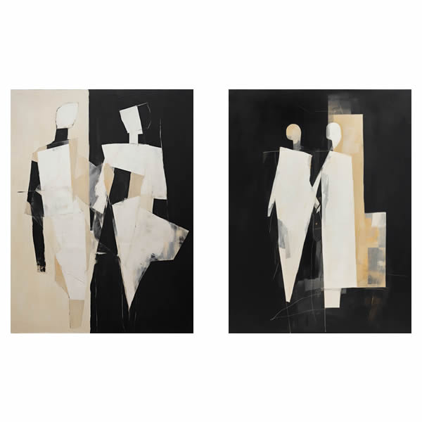 Esta maravilhosa pintura abstrata combina cores brancas e pretas contrastantes de uma forma ótima para criar um quadro versátil. Como prova de sua profundidade, a pintura contém detalhes ultrafinos que destacam o seu significado. As formas possuem influência do construtivismo, cubismo e arte acadêmica, com um toque incrivelmente moderno. As telas podem ser visto como um retrato do equilíbrio entre nossas dimensões visíveis e invisíveis. Os tons branco e preto desta pintura são simbólicos dos opostos que se unem, com a forma abstrata que dá o toque moderno. Como resultado, temos um Duo de Telas rico em significados, apesar de sua aparência simples. Esse Duo de Telas é tão versátil que se encaixa desde salas de estar modernas até galerias clássicas. Como uma obra de arte, ele também pode ser apreciado de longe e de perto, oferecendo detalhes interessantes à medida que se aproxima. Uma ótima adição que traz profundidade e significado para todos que o apreciam.