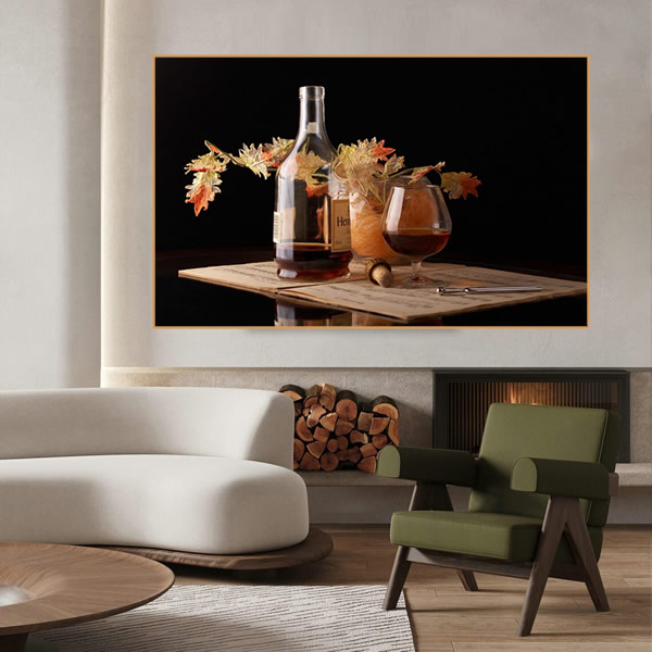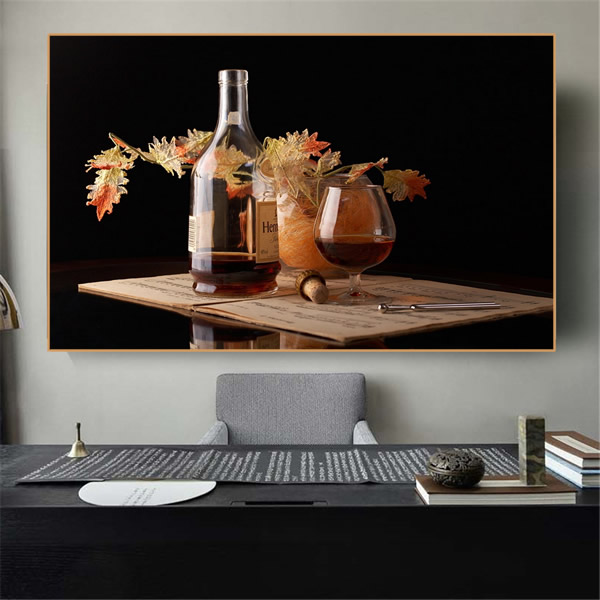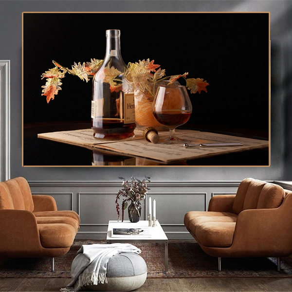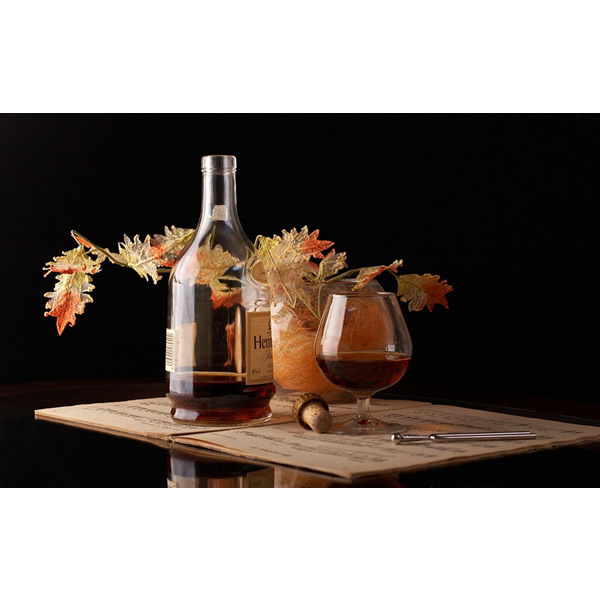 Cada detalhe está bem visível na tela: desde o volume dos copos, ao reflexo na garrafa, deixando a tela extremamente realista. Seu trabalho tem um acabamento perfeito – cada pequeno detalhe se encaixa harmoniosamente enquanto a luz e as sombras dão um efeito muito realista ao quadro.