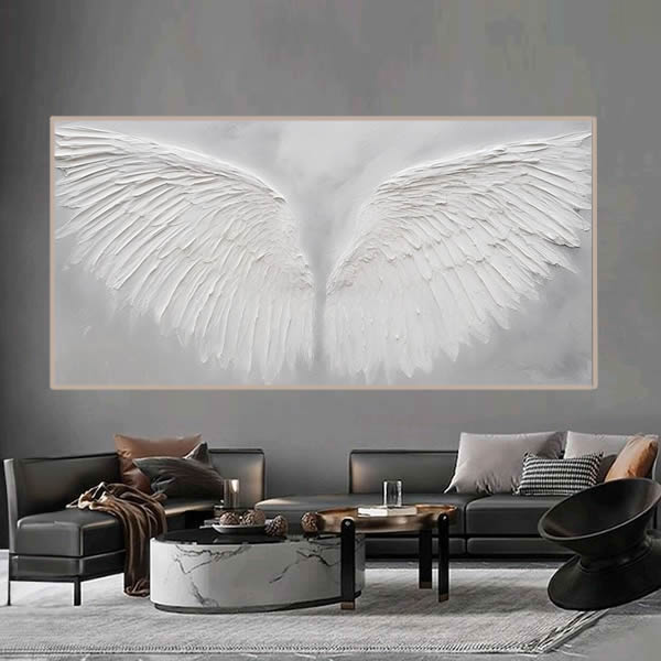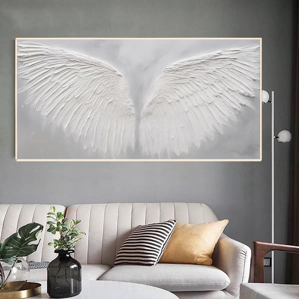 Esta obra de arte evoca uma quietude sublime, apresentando as asas majestosas de um anjo em uma paleta de brancos imaculados sobre um fundo neutro. A pintura detalha com uma delicadeza tocante as penas individualmente texturizadas, cada uma meticulosamente moldada e disposta em camadas harmoniosas que capturam a essência da pureza e da proteção celestial. O artista utiliza uma técnica refinada para criar um efeito quase tridimensional nas asas, dando a impressão de que estão prestes a bater. Esta representação não só destaca o esplendor angelical, mas também transmite um sentimento de tranquilidade e esperança, evocando a presença invisível e reconfortante de um anjo guardião. A escolha do branco como cor predominante reforça a simbologia de pureza e renovação espiritual, tornando a obra um ponto de meditação serena, perfeito para ambientes que buscam uma atmosfera de calma e introspecção.