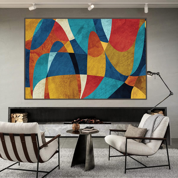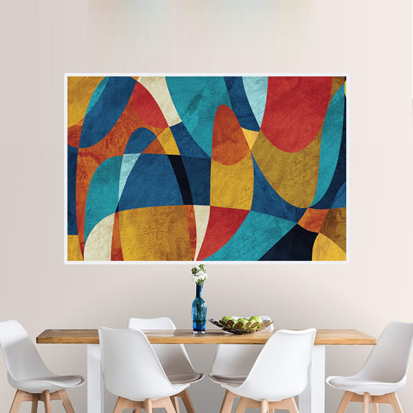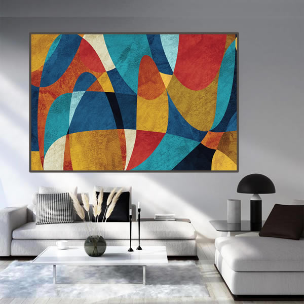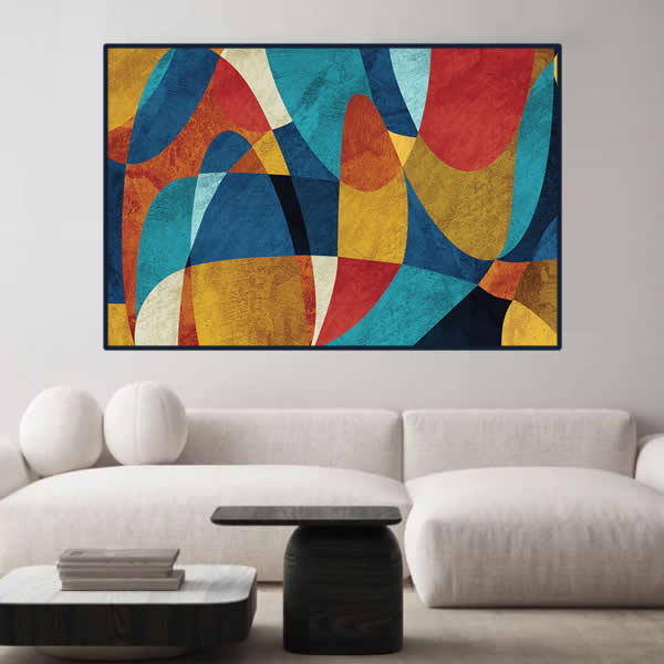 Esta obra de arte abstrata captura o olhar com uma combinação vibrante de cores e formas que se entrelaçam harmoniosamente. A pintura evoca uma sensação de movimento dinâmico através de suas linhas curvas e encontros de tons quentes e frios. As formas geométricas parecem dançar umas com as outras, criando um efeito visual que é ao mesmo tempo energético e pacificador. As cores, variando entre azuis profundos, vermelhos ardentes e amarelos solares, são dispostas de maneira que cada uma parece destacar-se e recuar ao fundo ao mesmo tempo, sugerindo uma profundidade que convida à contemplação. Este quadro pode ser interpretado de várias maneiras, dependendo do ângulo de visão e da luz que o ilumina. Ideal para ambientes modernos, essa obra transmite uma sensação de frescor e modernidade, enquanto toca em conceitos abstratos de interconexão e complexidade visual, fazendo com que cada observação seja uma nova experiência.