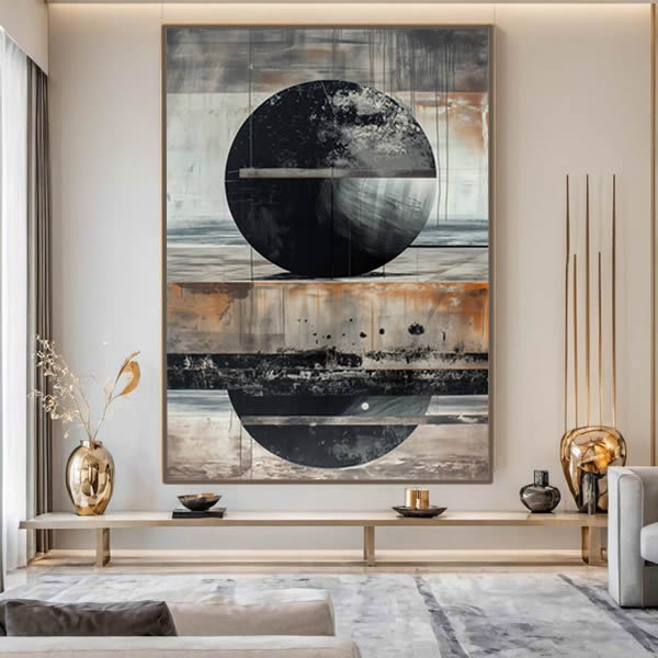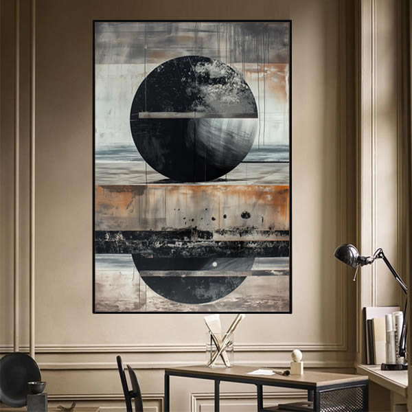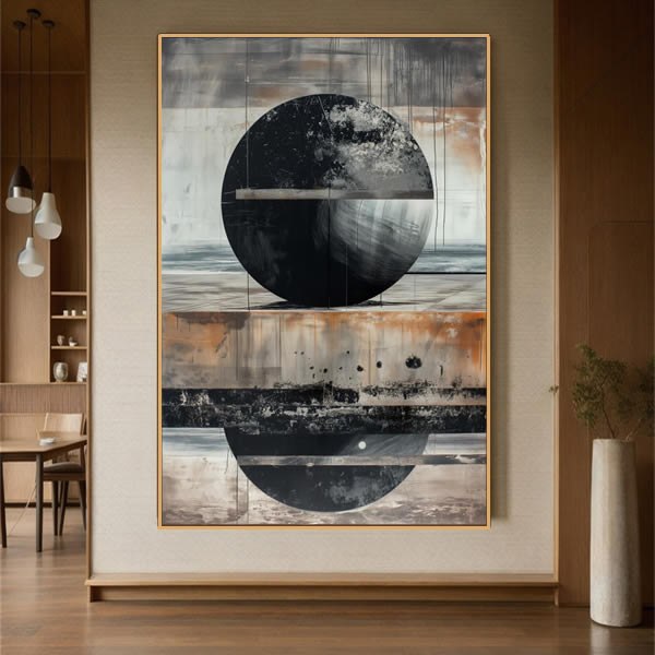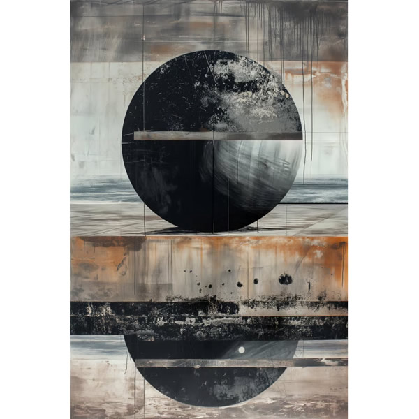 Esta pintura abstrata apresenta uma composição intrigante que combina uma esfera central dividida por linhas e texturas que sugerem uma mistura entre construção e destruição. A base da obra, com suas faixas horizontais que alternam entre tons claros e escuros, acrescenta uma sensação de movimento e fluidez ao mesmo tempo que evoca imagens de paisagens urbanas desgastadas pelo tempo. O contraste entre os elementos geométricos rigorosos e as formas mais orgânicas e fluidas na pintura cria uma tensão visual que é tanto perturbadora quanto bela. Esta obra pode ser interpretada como uma meditação sobre a transitoriedade, destacando a beleza encontrada na impermanência e no caos. É uma expressão poderosa da interação entre a natureza humana e os ambientes que construímos e, eventualmente, deixamos para trás.