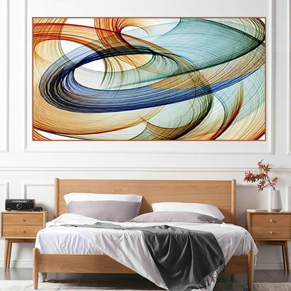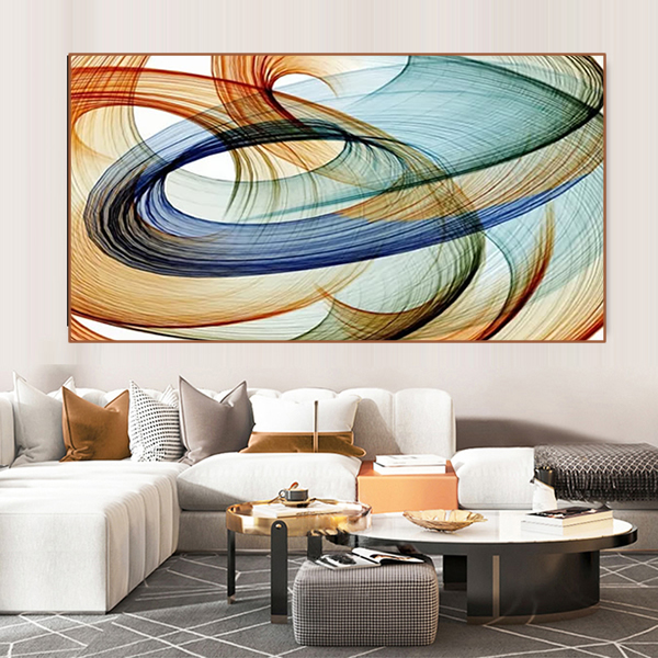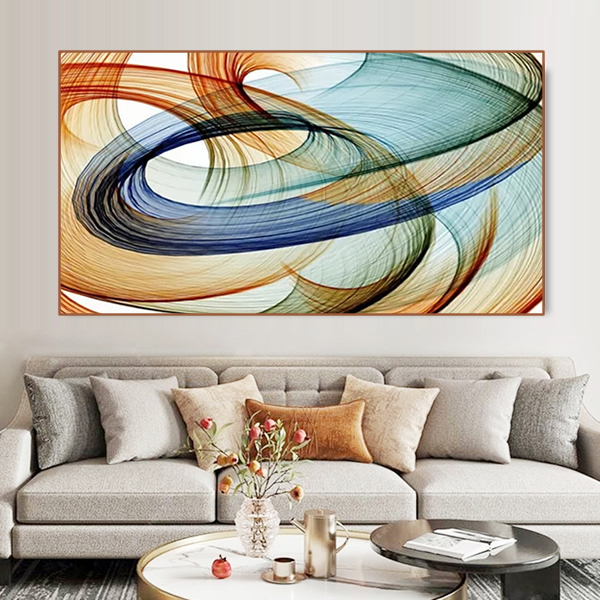 Esta pintura envolvida em tons vibrantes, transmite uma sensação única de tranquilidade, inspirada nos movimentos ondulatórios da natureza e da vida. Os seus contornos se enquadram perfeitamente na tela, envolvendo o ambiente e provocando um sentimento de bem-estar.