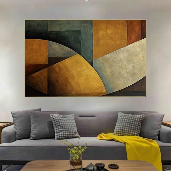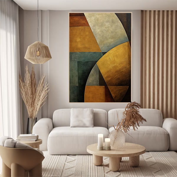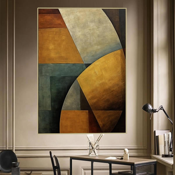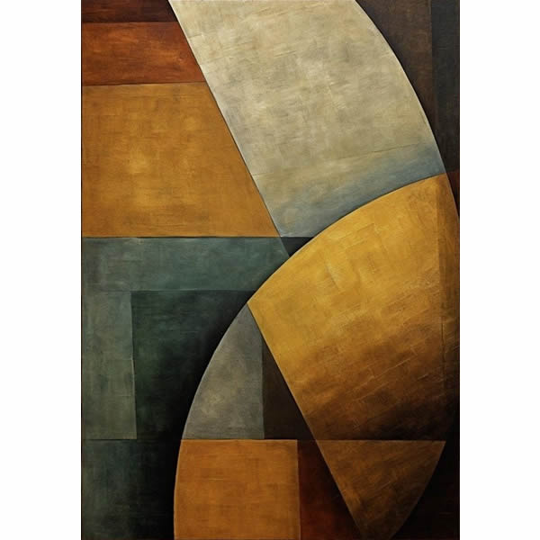 A pintura é uma composição abstrata que explora a interseção de formas geométricas em tons terrosos e neutros, como ocre, cinza e marrom. O uso de diferentes planos e curvas transmite uma sensação de movimento e profundidade, fazendo com que as formas pareçam sobrepor-se e interagir de maneira orgânica. A mistura de tons quentes e frios cria uma harmonia visual, ao mesmo tempo em que provoca um contraste sutil que guia o olhar do espectador por toda a tela. Com suas formas sólidas e bem definidas, a obra parece investigar a relação entre estrutura e fluidez, sugerindo uma interação entre estabilidade e dinamismo. A paleta de cores suave dá uma sensação de calma, enquanto as linhas curvas e os ângulos criam um jogo de tensões visuais. Essa pintura é um estudo profundo de formas abstratas, onde a geometria se torna uma metáfora para a complexidade das emoções e da vida moderna.
