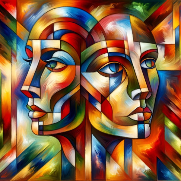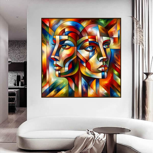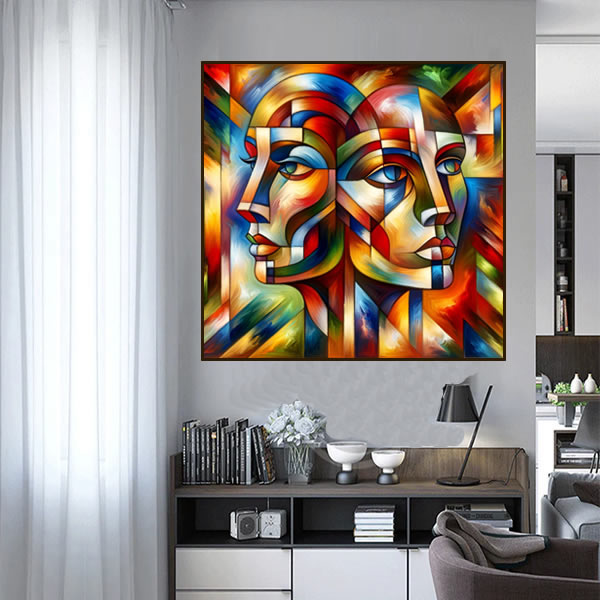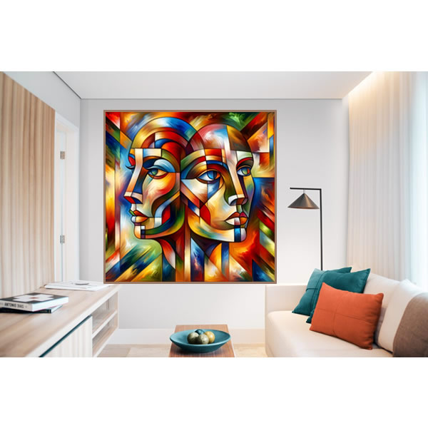 É uma obra de arte vibrante que se apropria da estética cubista para explorar a complexidade e a conexão entre duas entidades. A pintura apresenta dois rostos, um masculino e um feminino, cujas características são desmembradas e recompostas de maneira abstrata, criando um mosaico de formas geométricas e cores intensas. A técnica empregada imita a textura rica e a saturação profunda típica da pintura a óleo, com pinceladas que parecem se sobrepor em camadas, conferindo à obra uma dimensão tátil e uma presença imponente. A paleta de cores é audaciosa e expressiva, produzindo um contraste dinâmico e uma energia pulsante. Esta arte não é apenas uma celebração da cor e da forma, mas também um convite à reflexão sobre as relações humanas e a comunicação não verbal.