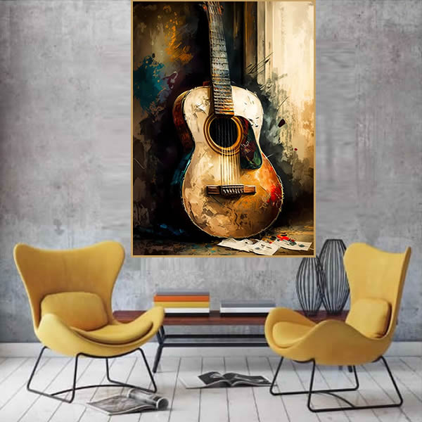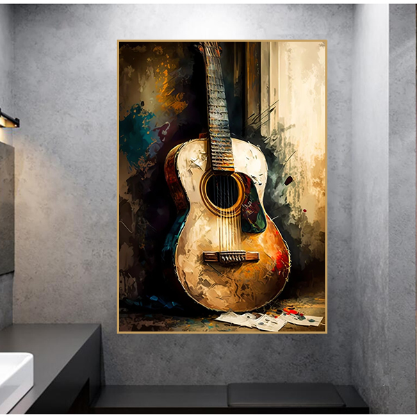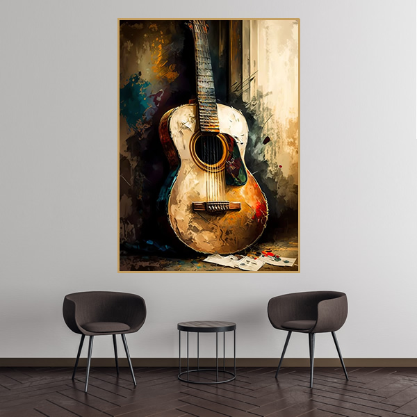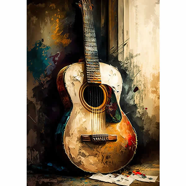 Esta obra de arte enigmática e meticulosa é um retrato único de um cenário íntimo. Nela, um violão descansa em uma mesa, iluminado pelo céu noturno. Os detalhes e a textura do instrumento são meticulosamente reproduzidos e se destacam contra o fundo escuro.
