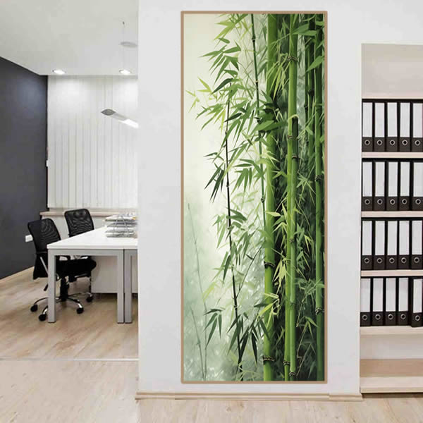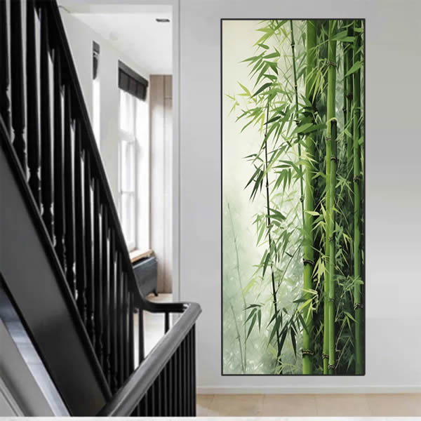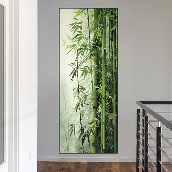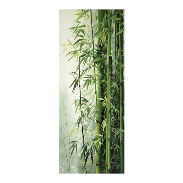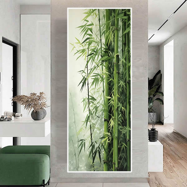 Esta pintura captura a beleza tranquila e a graciosidade dos bambus, uma planta que é profundamente enraizada nas culturas do leste asiático e simboliza a resistência, a flexibilidade e a serenidade. Com traços fluidos e uma paleta de cores suaves, a obra evoca uma sensação de paz e contemplação. O artista usou tons de verde e texturas sutis para dar vida a cada haste e folha, criando um efeito quase tridimensional que parece mover-se suavemente com o sopro de uma brisa imaginária. O fundo da pintura, com tons mais esbatidos e indistintos, sugere uma neblina matinal que se aloja entre as hastes, dando ao cenário um ar de mistério e isolamento. Este efeito não apenas reforça a impressão de profundidade na obra, como também amplifica o foco nos detalhes intricados dos bambus, destacando-os como figuras principais da composição. A obra convida o observador a perder-se nos detalhes minuciosos e na atmosfera calmante que evoca, oferecendo um refúgio visual da agitação do dia-a-dia.