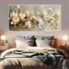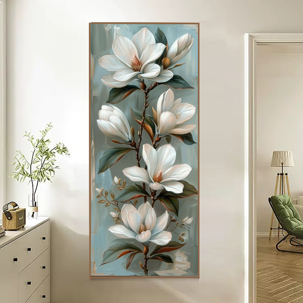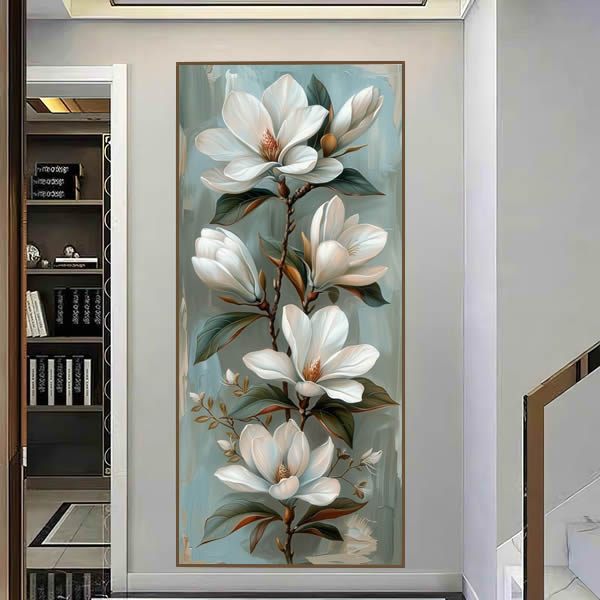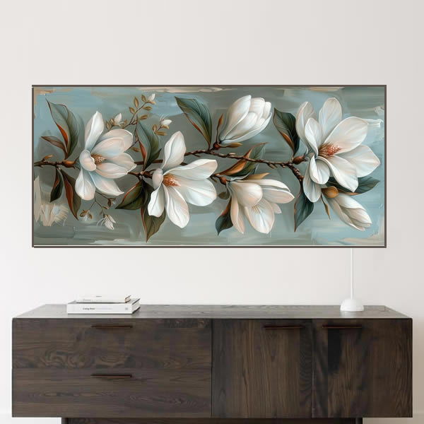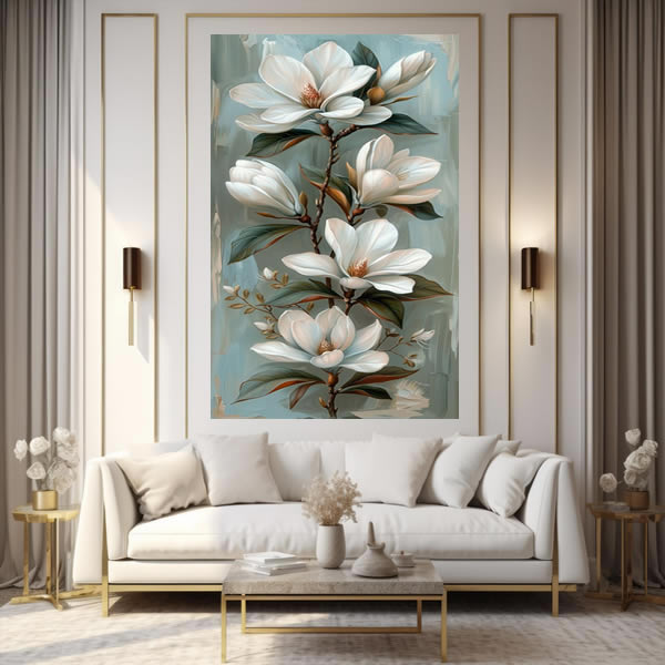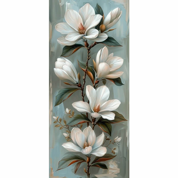 A pintura apresenta um ramo vertical de magnólias brancas, retratadas com impressionante realismo e suavidade, em um fundo neutro esverdeado com nuances de pinceladas artísticas. As flores se abrem em diferentes estágios, desde botões delicados até flores totalmente desabrochadas, sugerindo um ciclo de vida em contínua renovação. Os tons principais giram entre brancos acetinados, verdes acinzentados e marrons amadeirados, com detalhes dourados nas folhas e galhos que acrescentam um toque elegante e orgânico à composição. A disposição vertical das flores transmite elevação, pureza e harmonia. A pintura convida à contemplação e emana uma atmosfera de paz e serenidade, como se cada flor sussurrasse silêncio e beleza ao espectador. É uma obra ideal para espaços que buscam transmitir tranquilidade, requinte e conexão com a natureza.