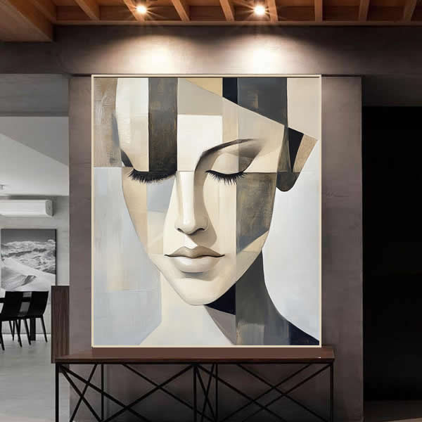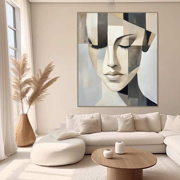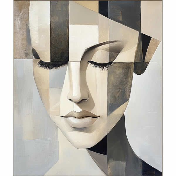 Nesta obra, a suavidade de um rosto feminino é entrelaçada com a rigidez de formas geométricas, criando um diálogo fascinante entre a emoção humana e a abstração racional. A paleta em tons neutros — que vai do bege ao cinza escuro — reforça o clima de introspecção e calma. Os olhos fechados e os traços delicados da personagem sugerem um estado de paz interior, enquanto os recortes retos e sobrepostos, como peças de um quebra-cabeça, transmitem a complexidade dos sentimentos ocultos. A textura da pintura, rica em camadas e nuances, dá profundidade ao contraste entre formas orgânicas e geométricas. A composição sugere que a identidade humana é construída a partir de múltiplas facetas — algumas reveladas, outras ocultas — em um equilíbrio delicado entre vulnerabilidade e força. A figura parece flutuar em um espaço atemporal, evocando tanto a fragilidade da memória quanto a eternidade da essência.