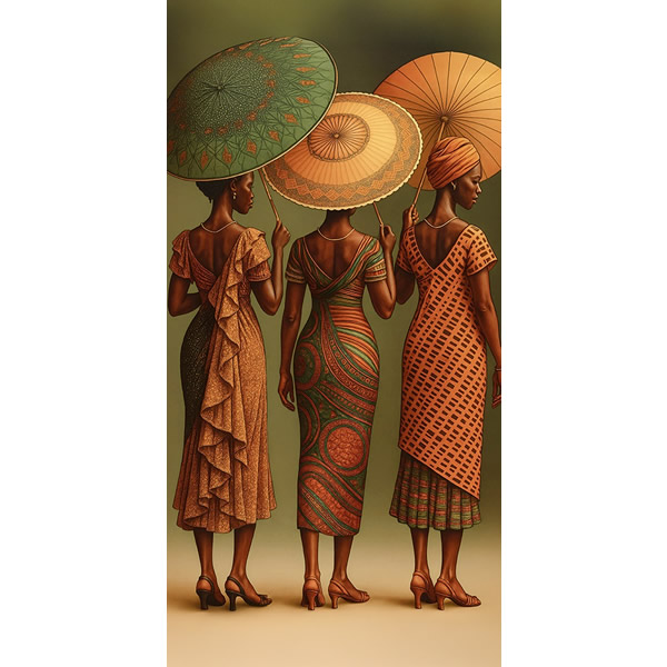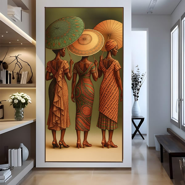 Esta bela pintura de arte figurativa tem uma palete de cores ricas que criam um ambiente único. É um detalhe incrível para qualquer casa. Você pode desfrutar dessa deslumbrante arte em qualquer lugar que desejar. A arte figurativa é a mensagem principal do artista. As três mulheres africanas criam um ambiente alegre, com seus guarda-chuvas em suas cabeças, que realmente contribuem para a adição de cor a esta obra de arte. É uma forma de arte que oferece ao observador uma oportunidade de imersão em seu próprio mundo. Esta pintura é tão maravilhosa que pode facilmente tornar-se o destaque de qualquer sala. Uma obra de arte tão significativa como esta não é achada todos os dias e terá o seu lugar na sua casa para sempre.