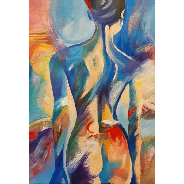 Esta obra de arte figurativa é um exemplo perfeito de fauvismo e arte acrílica. O artista usa cores intensas e abstratas para destacar os detalhes da figura ao mesmo tempo em que alcança uma atmosfera impressionante. O pintor mostra toda a sua habilidade técnica na criação desta obra. As tonalidades brilhantes de azul fazem com que a figura feminina se destaque e seja reconhecida de imediato. Os tons são perfeitamente arranjados e harmonizam com a figura, criando um ambiente íntimo e acolhedor.