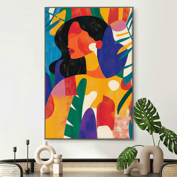 Nesta pintura, uma mulher emerge entre formas orgânicas e cores pulsantes, como se fosse parte de uma floresta tropical em festa. A paleta ousada — composta de laranjas, vermelhos, verdes, azuis e roxos — envolve o espectador em uma energia vibrante, quase musical. A ausência de traços faciais detalhados permite que a figura represente qualquer mulher, todas as mulheres — um arquétipo da força e da beleza feminina em harmonia com a natureza. A composição explora a fusão entre corpo, identidade e ambiente. Folhagens estilizadas cruzam a cena como camadas de pensamento, emoção e tempo, sugerindo que a figura está tanto inserida quanto em equilíbrio com o mundo ao seu redor. A geometria livre das formas cria um dinamismo visual que transforma a imagem em algo vivo, pulsante, como se estivesse em constante transformação. É uma celebração da liberdade, da cor e da presença feminina.
