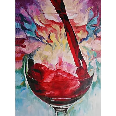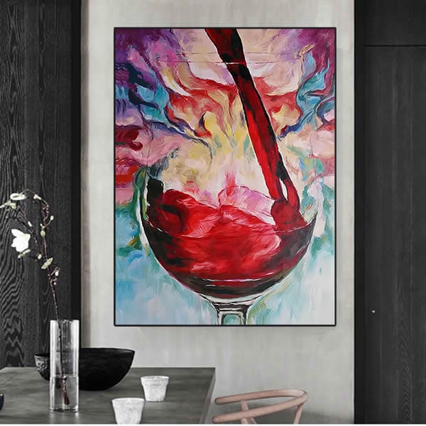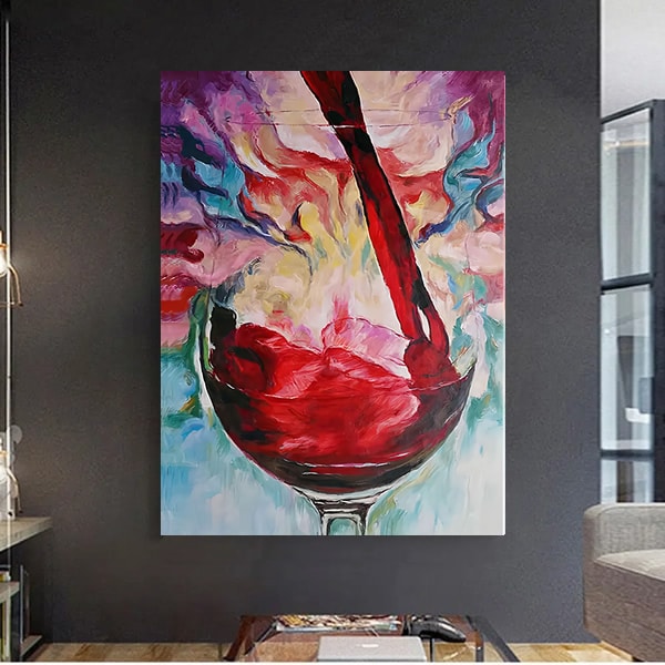 O drama da pintura emerge de seu centro focal – o vinho derramando. As texturas únicas criadas pelo líquido fluindo capturam a essência da bebida e seu visual. A sensação de movimento e fluxo é destacada pela paleta de cores e pelos contornos suaves. Os reflexos cintilantes criados pelo líquido também adicionam profundidade à obra.