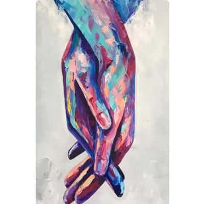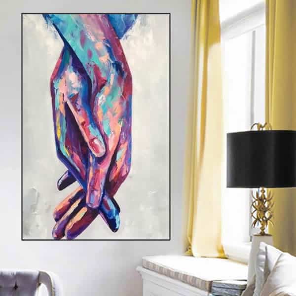 Esta pintura especial representa a união do amor. Uma mão segura a outra, como se fossem duas partes do mesmo ser. A imagem é profundamente romântica, e está pintada a óleo sobre tela.