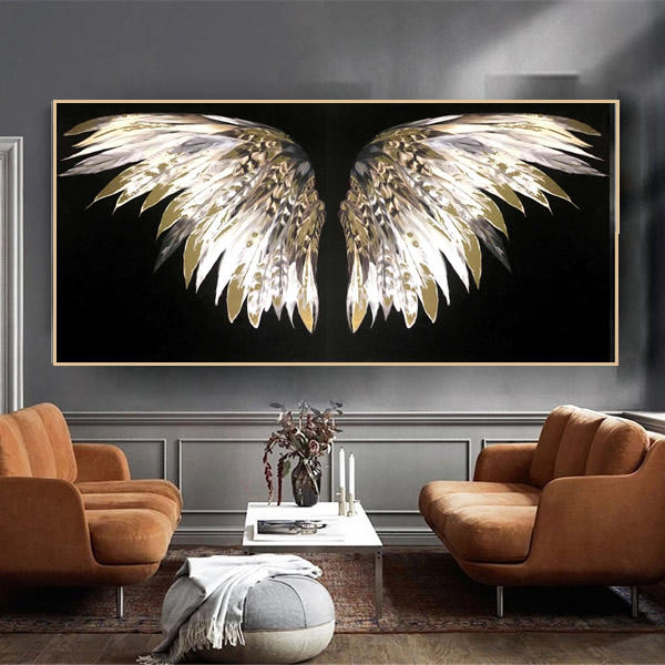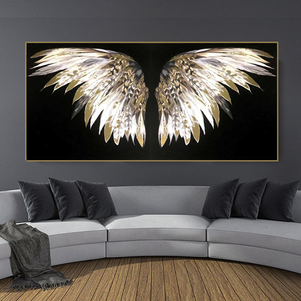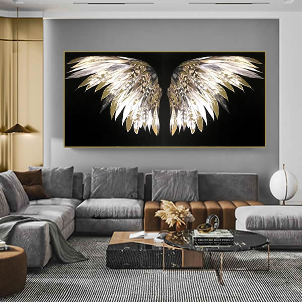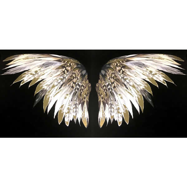 Esta linda pintura é uma obra de arte digital e tema gótico-angélico. O par de asas branco e dourado contra o fundo preto captura sua imaginação, enquanto a obra de arte incrível cria um sentimento único de calma e paz.