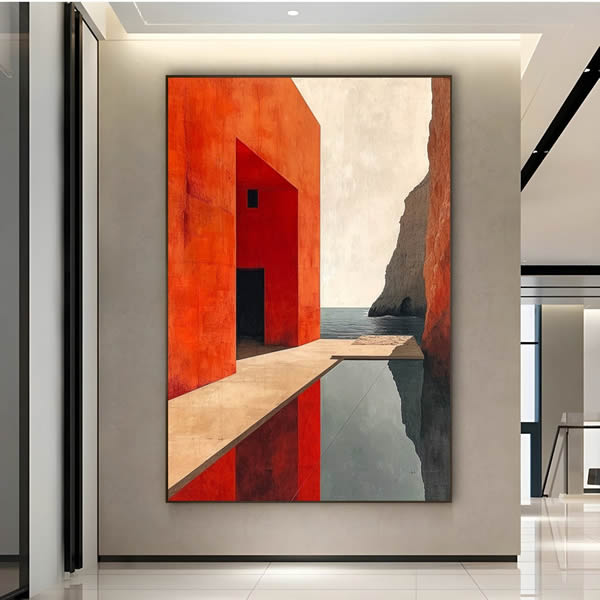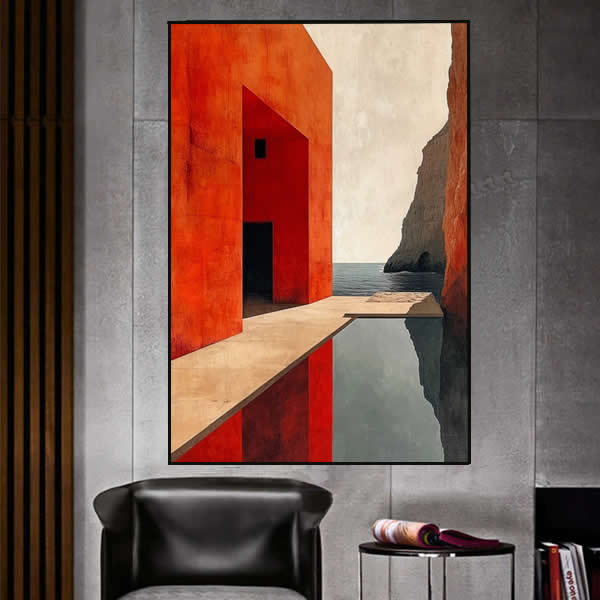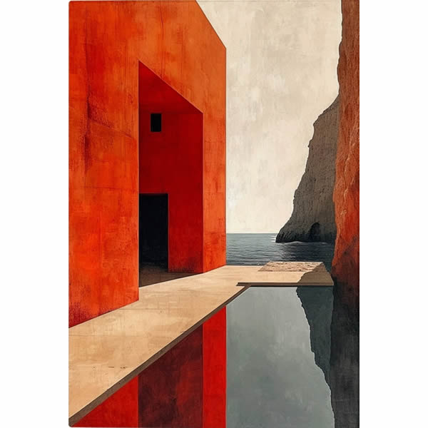 Esta pintura minimalista e impactante mistura elementos de arquitetura e paisagem natural, criando uma composição visualmente equilibrada e instigante. O forte contraste entre a geometria vermelha do edifício e o azul sereno do mar ao fundo transmite uma sensação de tensão e harmonia simultaneamente. A piscina reflexiva amplifica a profundidade e cria um elo entre o real e o abstrato, enquanto a luz suave ressalta as texturas das superfícies. O uso de linhas retas e ângulos marcantes evoca uma atmosfera de modernidade e contemplação. O portal negro no centro sugere mistério e convida o observador a explorar além do visível. Esta obra é um exercício de contraste e equilíbrio, onde cores quentes e frias, espaços abertos e fechados, se unem para criar uma narrativa visual silenciosa, mas profundamente evocativa.