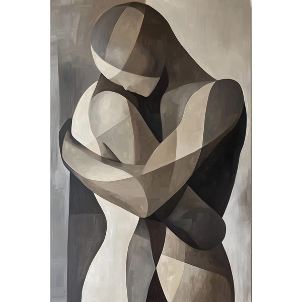 A imagem apresenta duas figuras humanas entrelaçadas em um abraço profundo e simbólico, retratadas em um estilo cubista abstrato com tons neutros e sobreposições geométricas. Os contornos dos corpos se misturam, criando uma fusão visual que transmite a ideia de unidade e conexão emocional. A ausência de cores vibrantes reforça a atemporalidade e a universalidade do gesto, permitindo que o observador se concentre na profundidade da emoção transmitida. Os contrastes entre claro e escuro dentro das formas sobrepostas sugerem uma dualidade complementar, como se duas metades se tornassem um todo inseparável. A postura inclinada das cabeças e o encaixe dos braços evocam sentimentos de conforto, entrega e proteção, enquanto a composição geométrica dá um toque moderno e sofisticado. A obra convida à introspecção, evocando a ideia de amor, união e a necessidade humana do contato e do afeto.