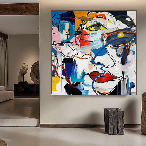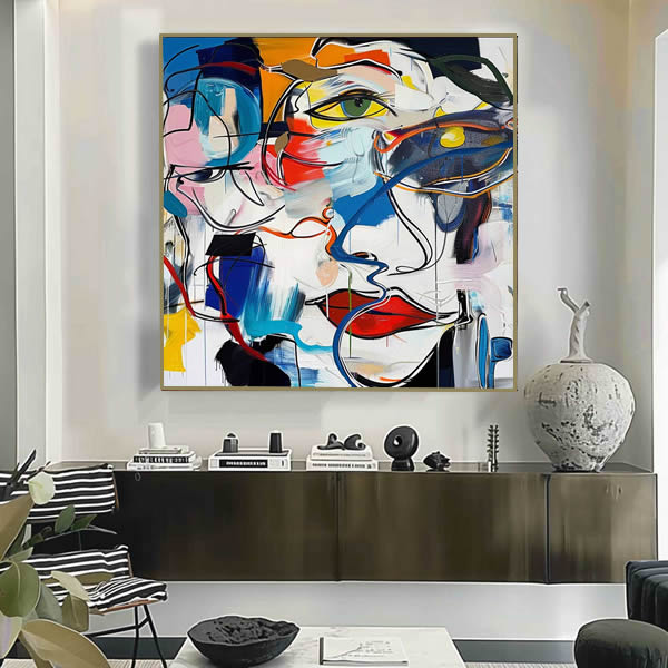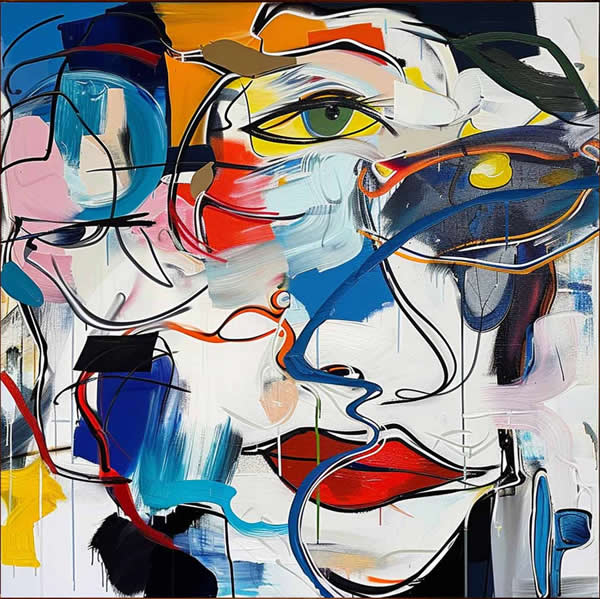 Esta pintura abstrata é uma vibrante explosão de cores e formas que entrelaçam diferentes elementos de um rosto humano. Traços sinuosos desenham o contorno de olhos, lábios e partes da face, enquanto pinceladas de azul, vermelho, amarelo e branco se fundem para criar um fundo dinâmico e multifacetado. O olho central, de cor verde vibrante, parece emergir da composição como um ponto de foco, enquanto os lábios vermelhos conferem uma sensualidade que contrasta com a fluidez caótica do restante da obra. A combinação de linhas precisas e pinceladas soltas dá à obra uma energia incontrolável, como se o artista tivesse capturado um momento de introspecção em meio ao turbilhão da mente humana. A pintura convida o observador a interpretar as camadas de emoções e expressões ocultas, provocando uma reflexão sobre a complexidade da identidade e da percepção. O uso de cores ousadas e a sobreposição de formas criam uma harmonia entre o caos e a ordem, tornando esta peça um retrato abstrato de intensidade emocional e beleza visual.