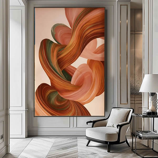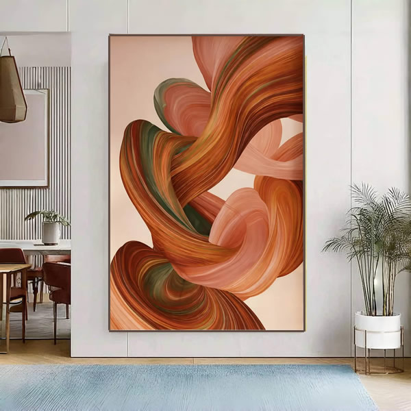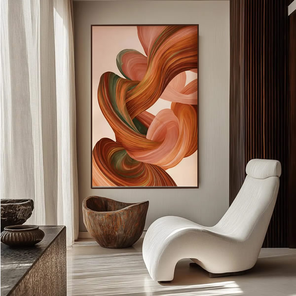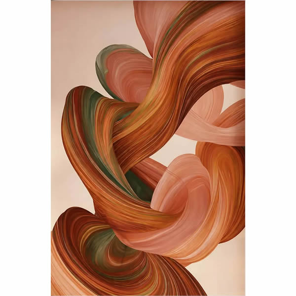 A obra apresenta um jogo envolvente de formas fluidas que parecem se mover continuamente pelo espaço da tela. Curvas amplas e elegantes se entrelaçam como fitas orgânicas, criando a sensação de movimento e transformação constante. Os tons quentes — que variam entre terracota, cobre, caramelo e nuances suaves de verde — evocam elementos da natureza, lembrando o fluxo da lava, as camadas da madeira ou as correntes de vento que moldam paisagens ao longo do tempo. A composição transmite simultaneamente energia e suavidade, como se as formas estivessem em uma dança silenciosa. Cada curva conduz o olhar do observador para a próxima, criando uma experiência visual quase hipnótica. A obra sugere a ideia de continuidade e de ciclos naturais, onde a matéria se transforma e se reorganiza, formando um equilíbrio delicado entre força, movimento e harmonia.