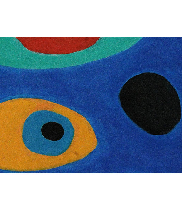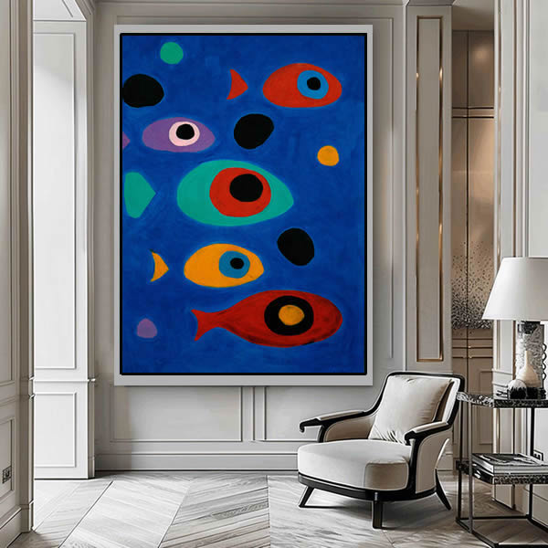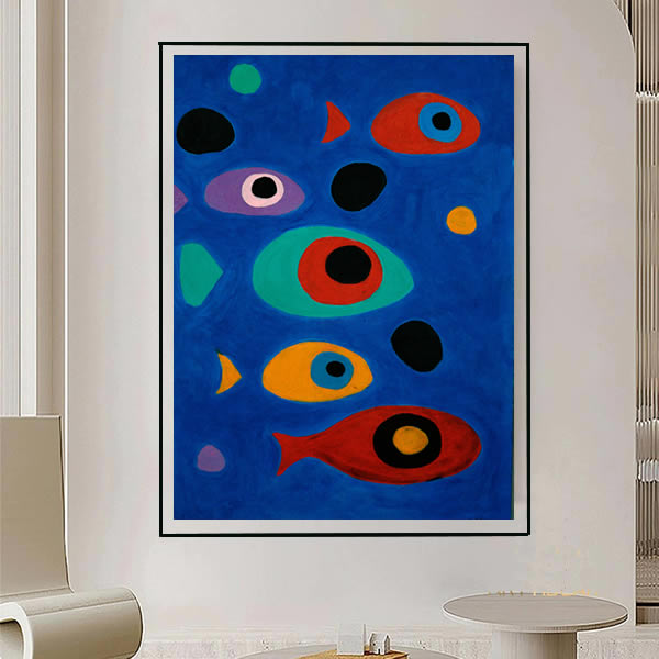 A imagem apresenta um cenário abstrato de fundo azul intenso onde formas ovais e circulares representam peixes estilizados em cores vibrantes como vermelho, laranja, verde, roxo e amarelo. As formas são simplificadas ao extremo, remetendo a um estilo infantil ou a uma releitura moderna e geométrica da arte surrealista, lembrando elementos do universo visual de Joan Miró ou Paul Klee. Cada “peixe” é construído com círculos concêntricos em contraste cromático, evocando simultaneamente olhos e corpos aquáticos, criando um efeito hipnótico e lúdico. A ausência de contornos definidos e a paleta saturada sugerem uma liberdade artística que brinca com a percepção e a simbologia marinha. O fundo monocromático em azul ultramar potencializa o contraste das figuras flutuantes, dando a impressão de um oceano onírico onde os peixes não nadam apenas — eles observam. É uma obra que convida o espectador a mergulhar em um universo subaquático imaginado, onde o olhar é tanto o tema quanto o meio de navegação.