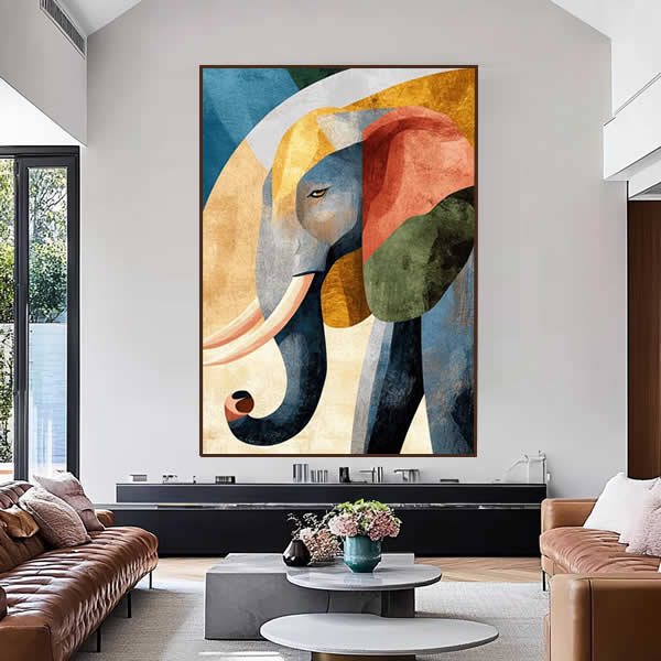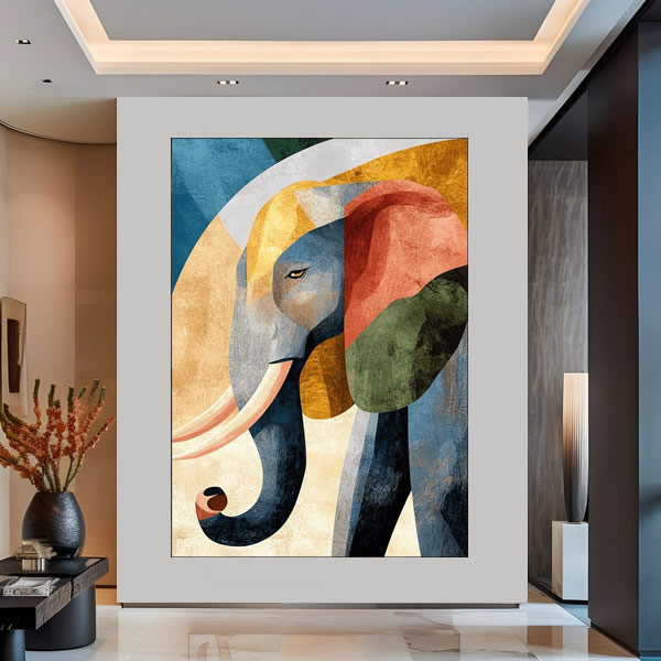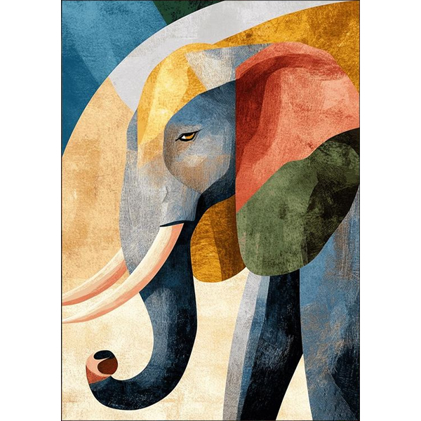 Esta obra de arte retrata um elefante majestoso em estilo abstrato, utilizando formas geométricas sobrepostas e uma paleta rica em tons terrosos, azuis profundos e vermelhos queimados. As texturas suaves, que remetem a pinceladas digitais ou técnicas de colagem, criam uma fusão entre o natural e o moderno. O olhar do elefante transmite uma serenidade enigmática, enquanto suas orelhas, tromba e presas se revelam por meio de cores contrastantes, como se cada fragmento contasse uma parte de sua história. O fundo, em tons claros de areia, contribui para destacar ainda mais a figura do elefante, remetendo às paisagens áridas de savanas africanas, onde esses animais habitam. A composição transmite força e equilíbrio, ao mesmo tempo em que brinca com o conceito de fragmentação — como se o elefante fosse uma memória antiga reconstruída em pedaços de cor e luz. A imagem combina elegância e simbolismo, sendo perfeita para provocar contemplação em ambientes modernos ou artísticos.